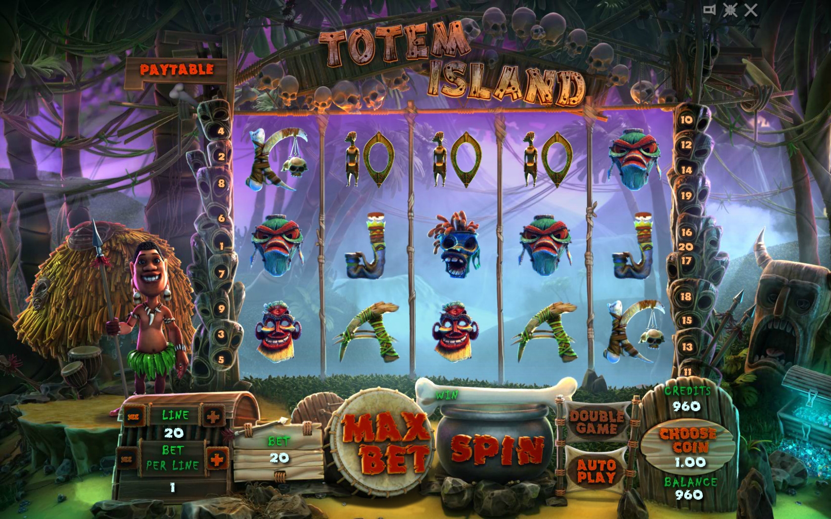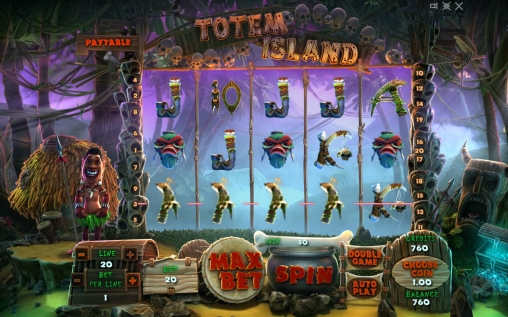 Totem Island – бесплатный игровой автомат с пять барабанами, двадцатью линиями и тремя рядами картинок. Разрешается задействовать одну, три, пять, девять, пятнадцать или двадцать полос. Клиент может ставить на каждую из них до сорока монет достоинством от 0.01, 0.10, 1 или 10 кредитов. Таким образом, на раунд принимается от одного цента до восьми тысяч кредитов. Ставки по линиям всегда одинаковы.