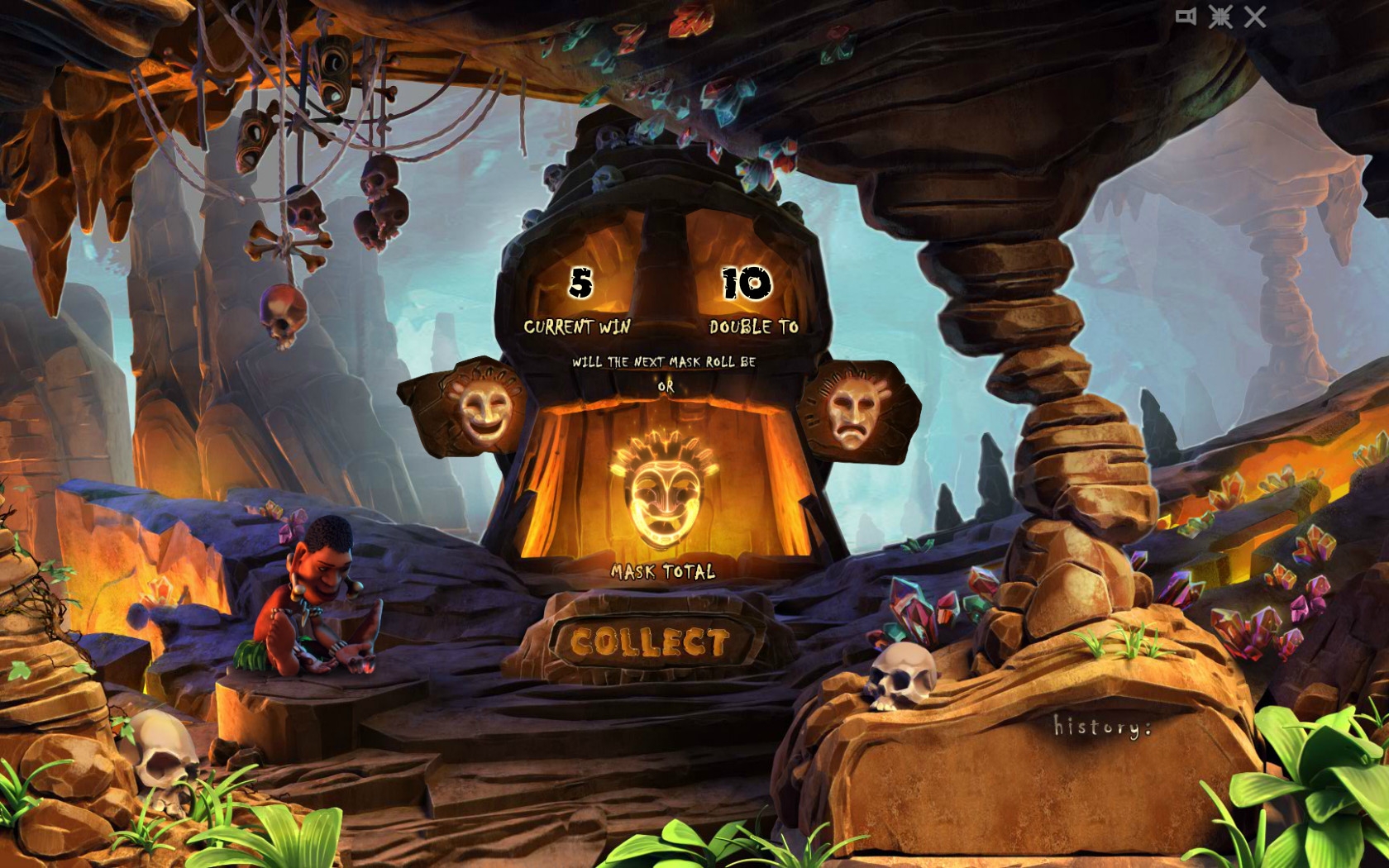 Она запускается на отдельном экране, где вы окажетесь в святилище племени. Вам нужно будет выбрать один из двух символов. Если вам повезет, выплата удвоится. Если нет, вы лишитесь денег. Разрешается действовать несколько раз подряд. Ошибаться нельзя ни разу.