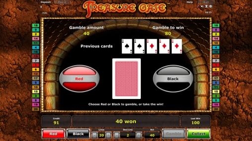 Риск-игра по равным шансам в Treasure Gate начинается по желанию клиента. Здесь необходимо угадать цвет закрытой карты, чтобы выплата удвоилась. Если ответ неверный, деньги уходят в кассу заведения. О лимитах читайте в справке.