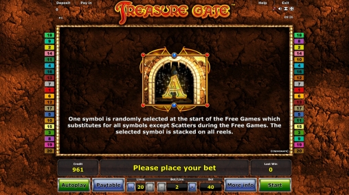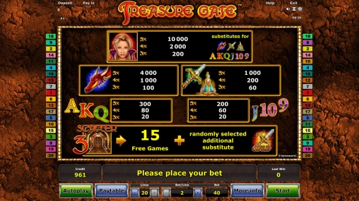 Испытать игровой автомат бесплатно или играть в Treasure Gate на деньги предлагают порталы на лицензионном софте Novomatic. Выбрать лучшее онлайн-казино помогут обзоры Casinoz и отзывы клиентов.