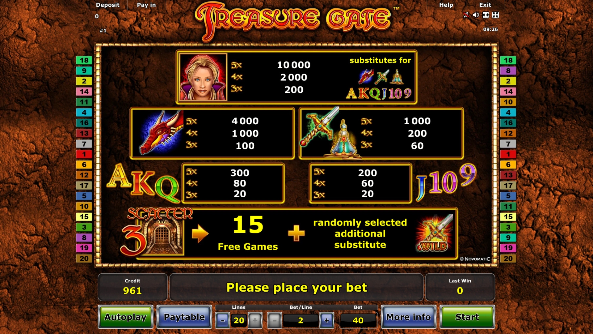 Играть на автомате Treasure Gate можно по одной, пяти, десяти, пятнадцати или двадцати активным полосам. На них принимаются равные ставки. Лимиты выясняйте в интернет-казино.