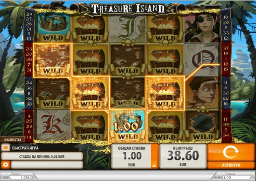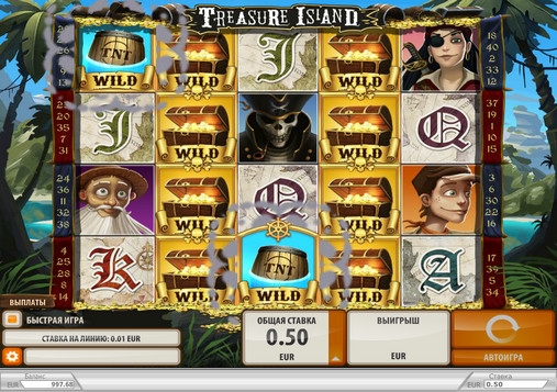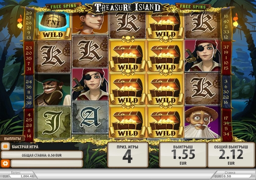 Treasure Island – пятибарабанный игровой автомат с широким выбором особых символов, русскоязычным интерфейсом, тематическими бонусными раундами, бесплатными спинами и многими другими функциями. В видео-слоте картинки выстраиваются на экране в четыре ряда.