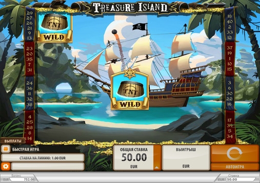 Специальными символами в игровом автомате Treasure Island являются Stacked Wild (золото в сундуке), Bonus (компас) и TNT Wild (бочка со взрывчаткой).