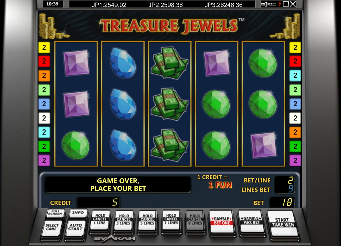 Предельно простые картинки, привычные правила. Камушки совпадают, деньги получаешь, нет так нет. Ни бонусной игры, ни других модных в последнее время фишек нет тоже, автомат для любителей чистого гемблинга без заморочек.