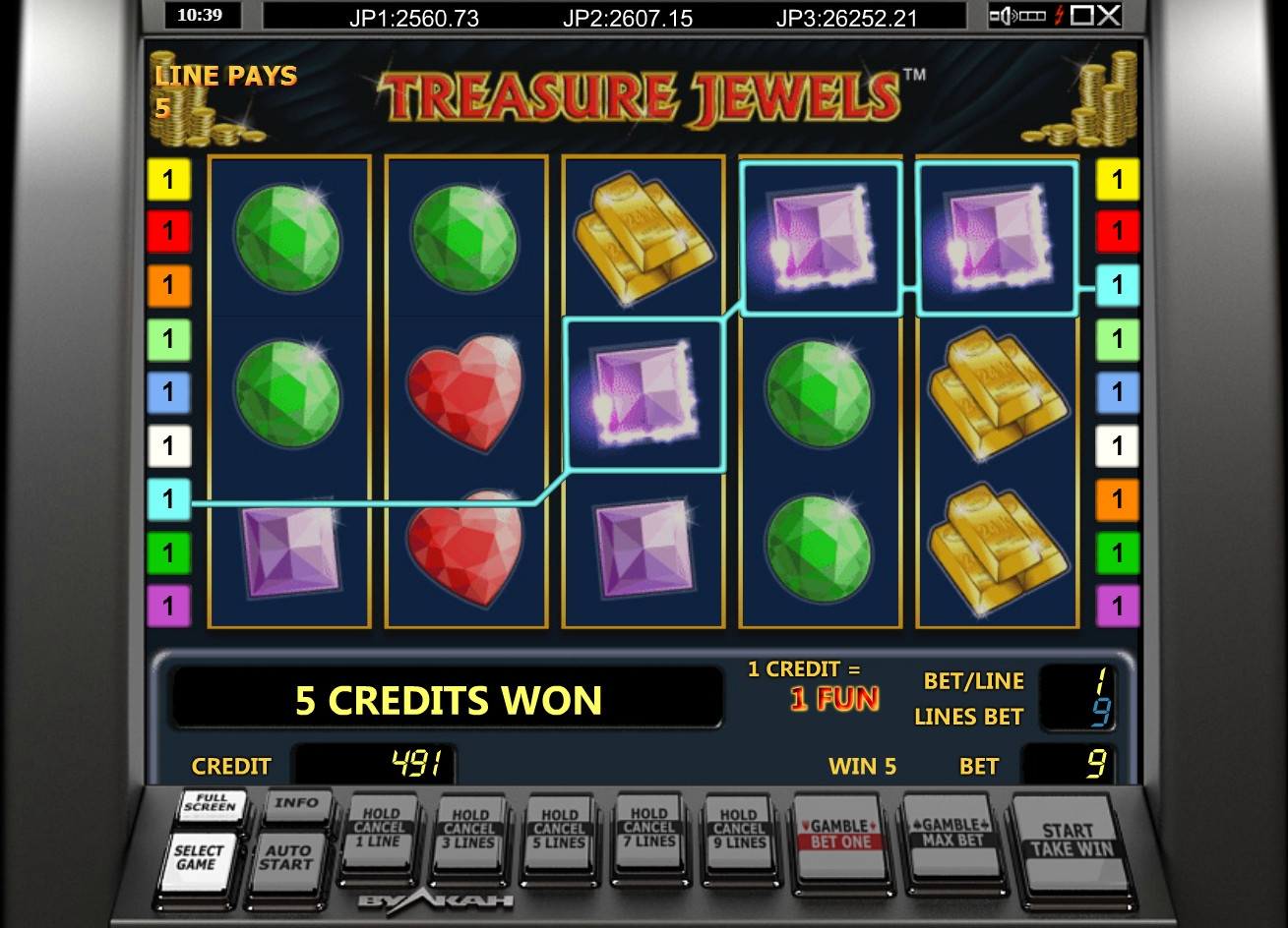 Treasure Jewels имеет пять барабанов и девять активных линий, что является стандартом для целой серии автоматов данного бренда. Но вы можете задействовать не только сразу все полосы для формирования на них комбинаций, а также одну, три, пять или семь.