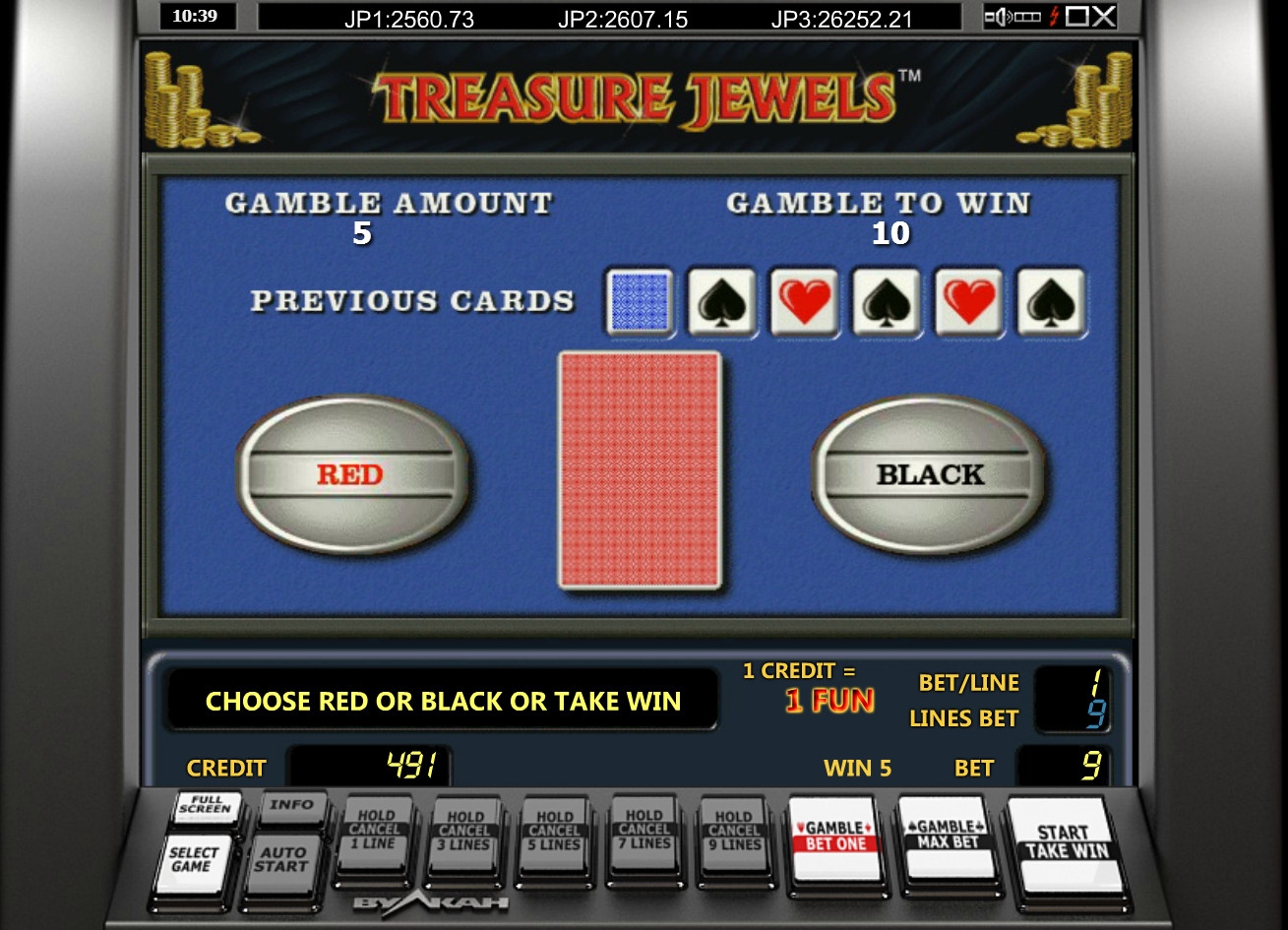 По завершению раунда, принесшего выплату, можно запустить раунд на удвоение. Он выдержан в наиболее распространенной форме. Вы увидите закрытую карту и должны будете угадать ее цвет. Назовете правильно – сумма удвоится. Ошибетесь, лишитесь ставки. Подряд можно играть, пока не достигнете максимума, но разрешается выходить на любом этапе.