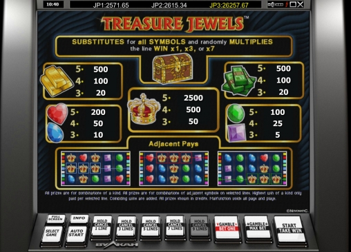 Помимо простых картинок, действующих по классическим правилам, в Treasure Jewels есть символы с расширенными опциями, дополнительные множители, а также раунд игры по равным шансам.