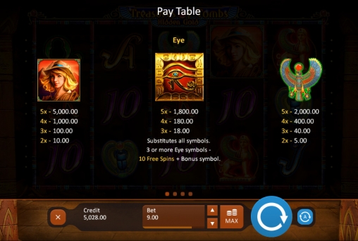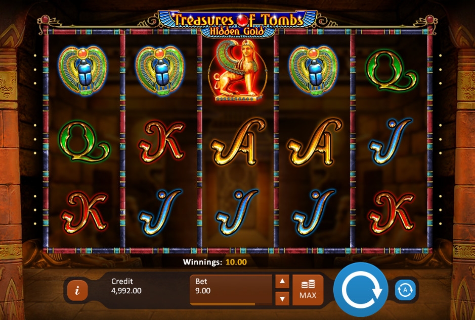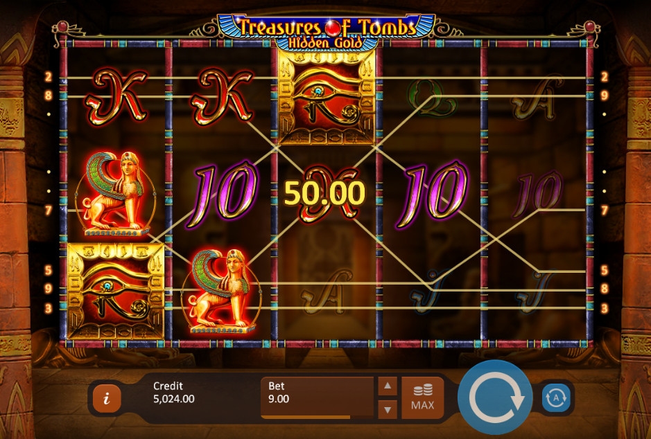 Игровой автомат «Сокровища гробниц: Тайное золото» имеет пять барабанов с представленными на них различными картинками. Символы располагаются на экране в три ряда.
