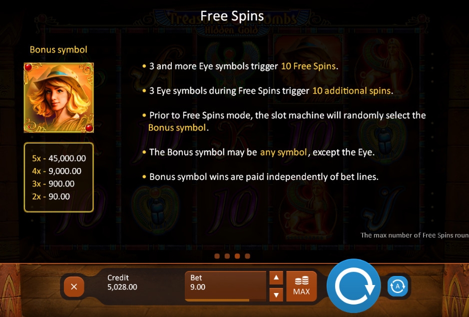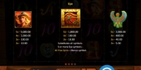 Размер выигрыша определяется по ставке на линию и специальному коэффициенту от х5 до х5000. Он закреплен за каждой из возможных в Treasures of Tombs: Hidden Gold комбинаций. Эти показатели перемножаются, а при нескольких выплатах начисленные кредиты суммируются.