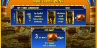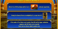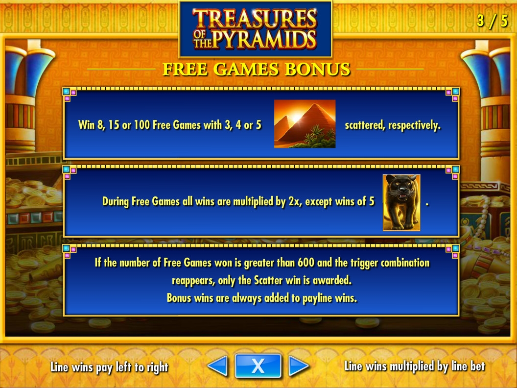 В Treasures of the Pyramids есть раунд фри-спинов. За три, четыре или пять Scatter присуждаются восемь, пятнадцать или сто бесплатных вращений соответственно. Ставку за клиента здесь делает казино. Ее размер и количество активных линий остаются прежними.