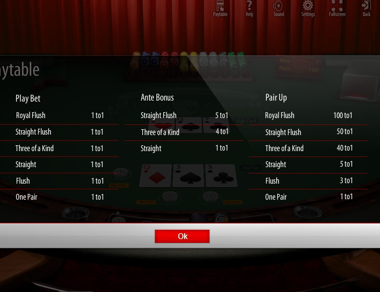 О ставке Pair Up поговорим чуть ниже, а сейчас рассмотрим правила основных ставок Ante и Bet. Перед раздачей игрок ставит анте. Она может быть от одного до ста евро. Далее он получает три карты. Себе виртуальный дилер также сдает три карты, но их пользователь не видит.