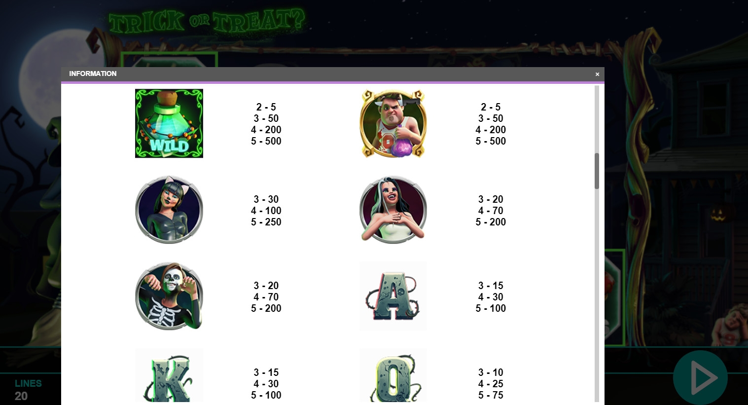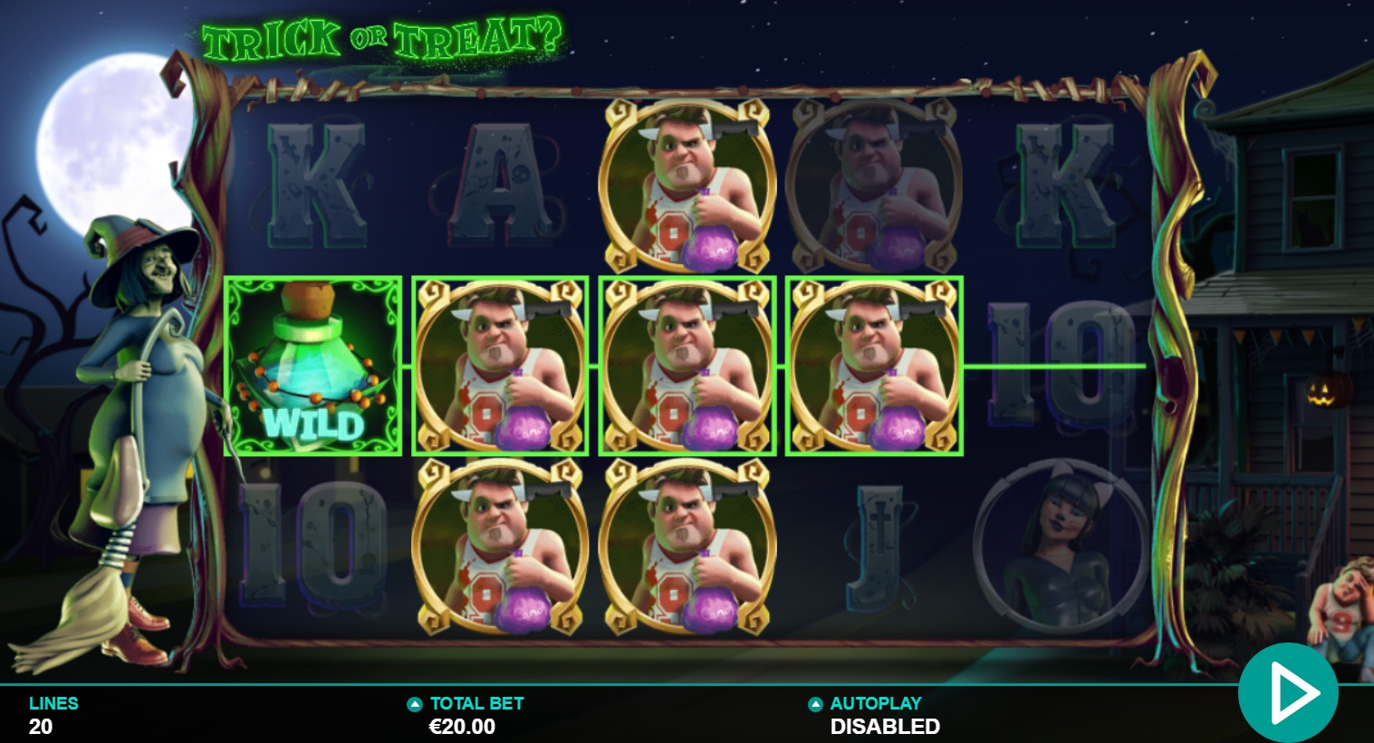 Играть на автомате Trick or Treat можно лишь по двадцати полосам. На них принимаются равные ставки в диапазоне от одного цента до десяти евро (0.20 – 200 евро на спин).