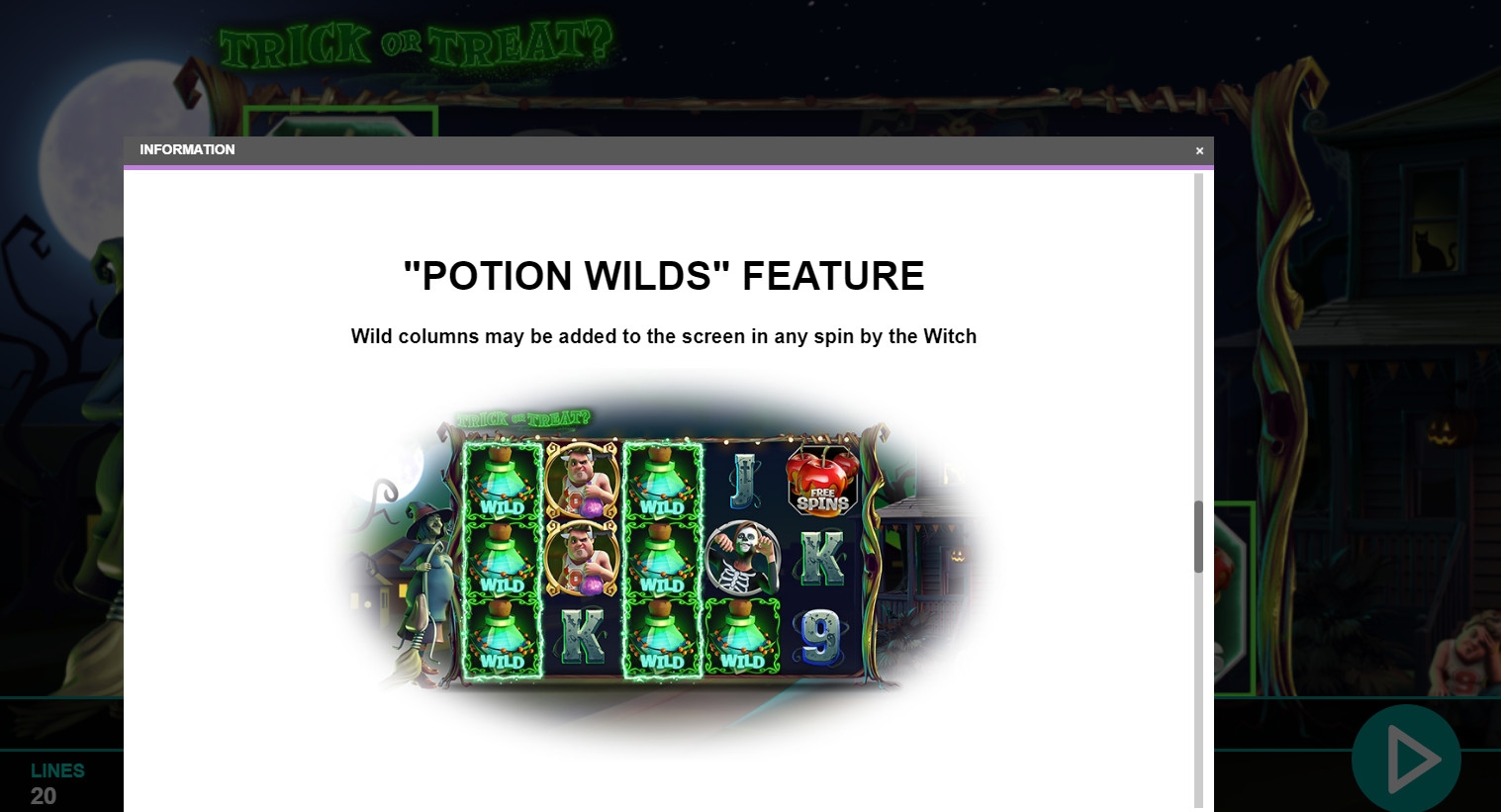В игре доступны десять базовых картинок, джокер, бонусные символы, а также призовые розыгрыши Creepy Candy, Jack O’Lantern и Potion Wilds.