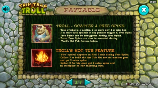 Разработчики использовали в аппарате девять обычных иконок, скаттеры, джокеры, бонусные символы, фри-спины, а также призовые функции Troll’s Hot Tub, Goats Go Wild и Crashing Cages.