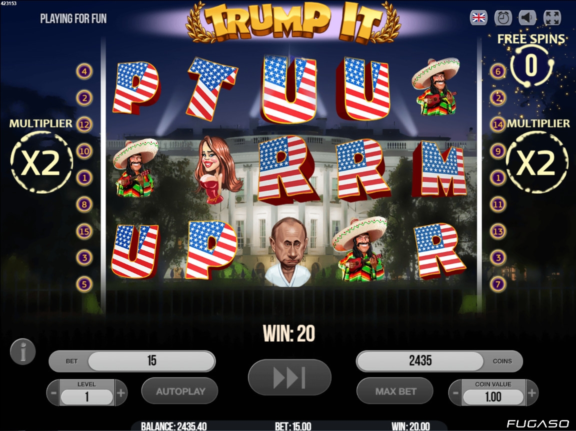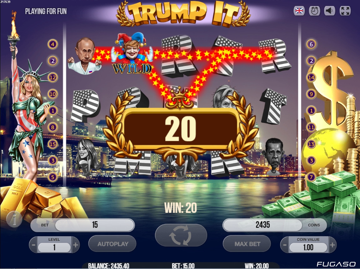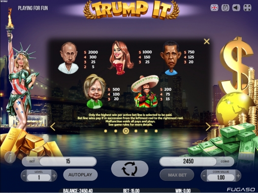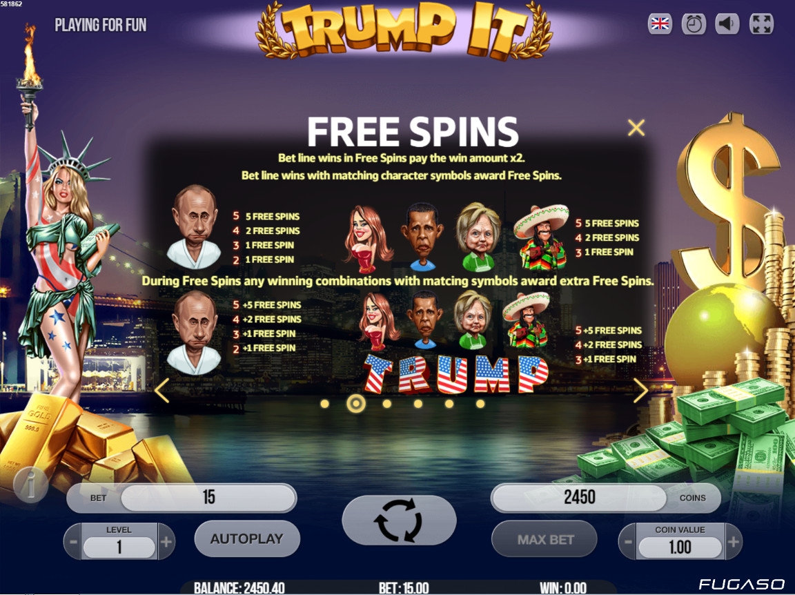 Трамп оказывается теперь еще и герой казино. Хорошую игрушку создали разработчики "Fugaso". Очень радует наличие "вращение", но не весьма удобно отсутствие бесплатной, пробной игры, особенно для новичков!