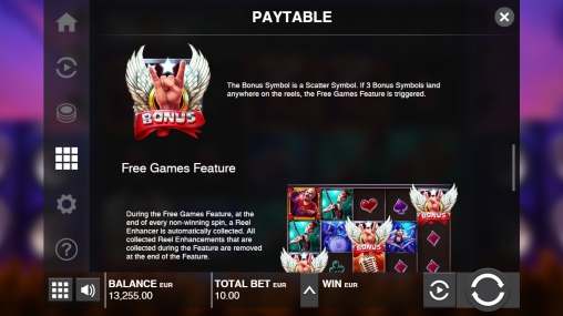 - Bonus (рокерская «коза») не образует выигрышные последовательности, но запускает фри-спины. Они начинаются, когда от трех иконок выпадают в любых ячейках.