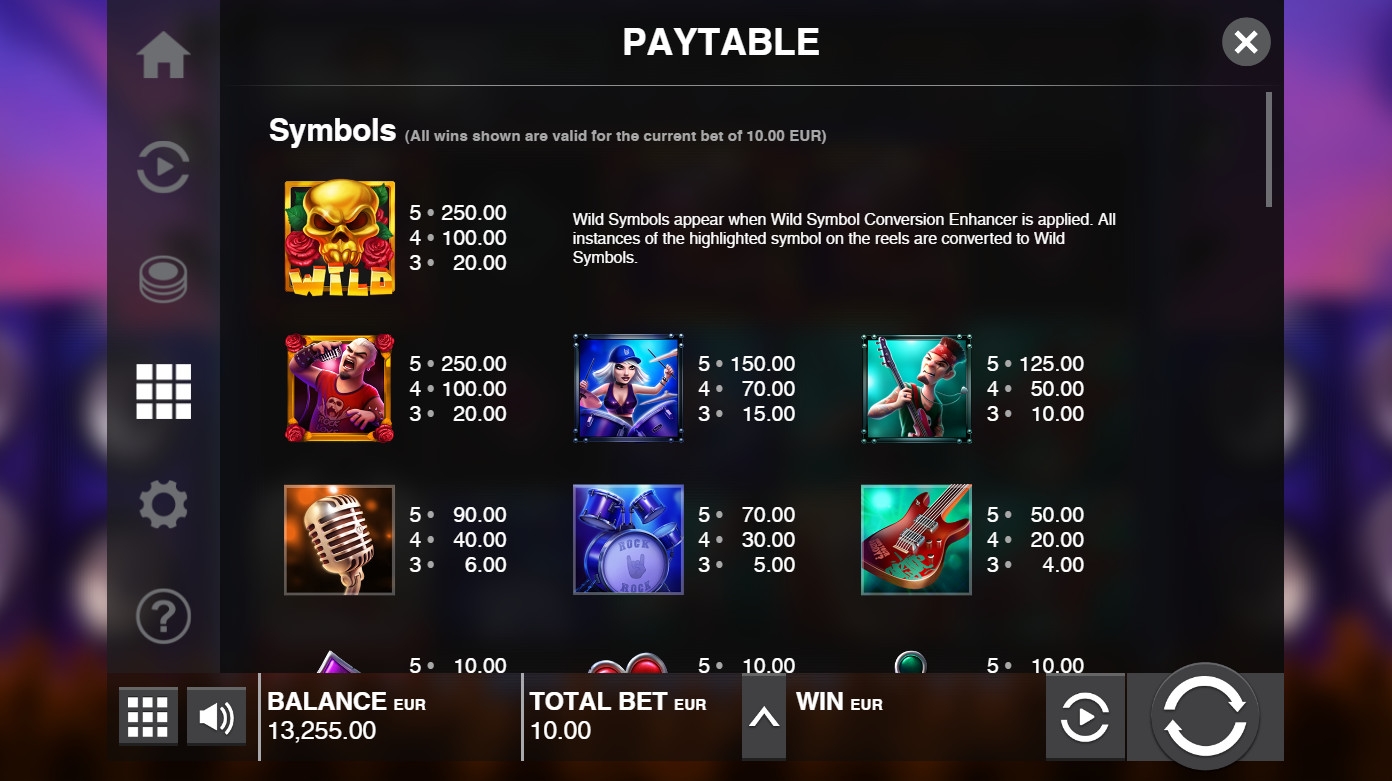 В игровом автомате Turn It Up! пять барабанов, десять постоянно задействованных линий и по три символа в каждом столбце на экране.