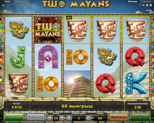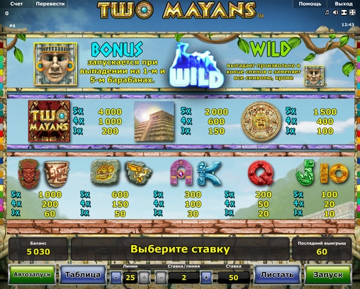 играть на игровом автомате «Два майя» по любому количеству линий до двадцати пяти, поставив на одну линию от двух до четырехсот кредитов. Это означает, что максимальная ставка на раунд равна десяти тысячам кредитов.
