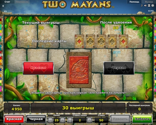 В видео-слоте Two Mayans есть классическая игра на удвоение. Вам нужно угадывать цвет закрытой карты. Если ответите правильно, общая выплата за спин увеличится в два раза. Если ошибетесь, то потеряете выигрыш. Количество удачных попыток в одном раунде ограничивается правилами казино.