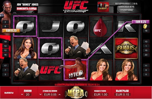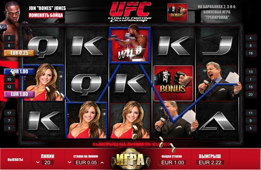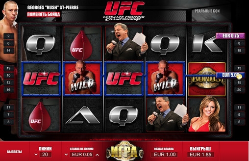 Играть на игровом автомате Ultimate Fighting Championship можно по одной – двадцати линиям, поставив на каждую из них от одного цента до двадцати пяти евро. На спин принимается до пятисот евро.