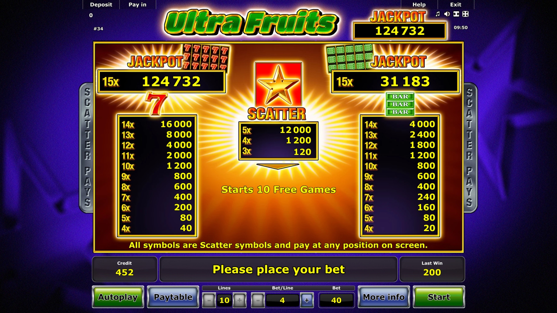 Имейте в виду, что автомат имеет отнюдь не низкий уровень дисперсии. Хотя все картинки являются скаттерами, комбинаций не так много, как можно подумать при беглом знакомстве с правилами. Показатель возврата тоже не назовешь высоким, но так часто бывает в играх с джекпотами.