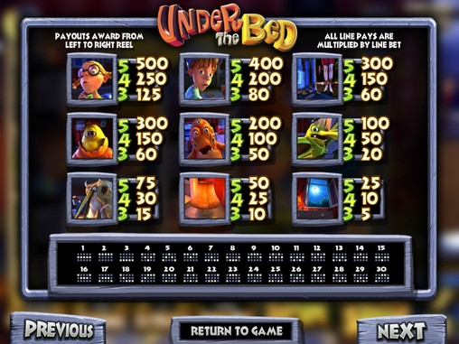 Играть на игровом автомате Under the Bed можно по любому количеству линий до тридцати. На каждую из них принимается ставка в одну – пять монет номиналом от двух до пятидесяти центов. Несложно подсчитать, что на спин можно поставить не более семидесяти пяти евро.