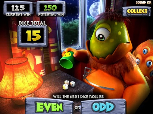 Полученную за спин выплату можно поставить на кон в игре по шансам видео-слота Under the Bed. Здесь необходимо играть в кости со странным чудовищем из детских кошмаров. Процесс интуитивно понятен и дополнительных разъяснений не требует. Просто выбираете один из вариантов исхода. Если угадаете – выплата удвоится. Если ошибетесь – лишитесь выигрыша.