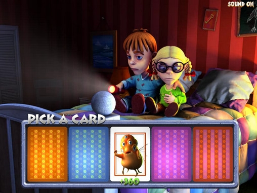 В бонусном раунде видео-слота Under the Bed вы увидите детей, сидящих на кровати в темной комнате. Под ними будут находиться пять карт. Вам нужно будет открывать их в произвольном порядке. Если на карте изображен монстр, вы получите какую-то выплату, после чего это чудовище появится, чтобы ужаснуть малышей. Выбирать карты можно до тех пор, пока не будут открыты все пять, или пока в одной из них не попадется слово Collect. После этого все выплаты будут переведены на ваш счет.