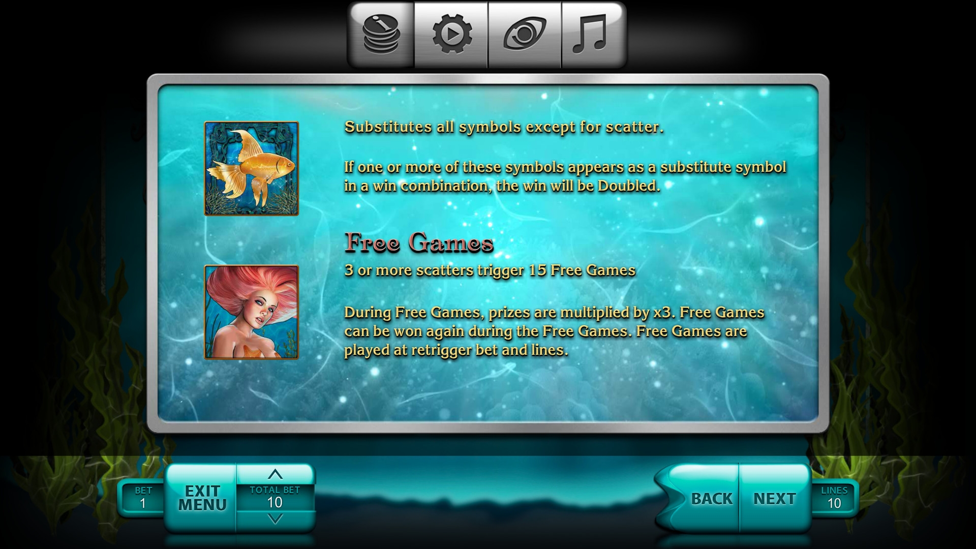 Специальные функции выполняют Wild (золотая рыбка) и Scatter (русалка). О них чуть подробнее: