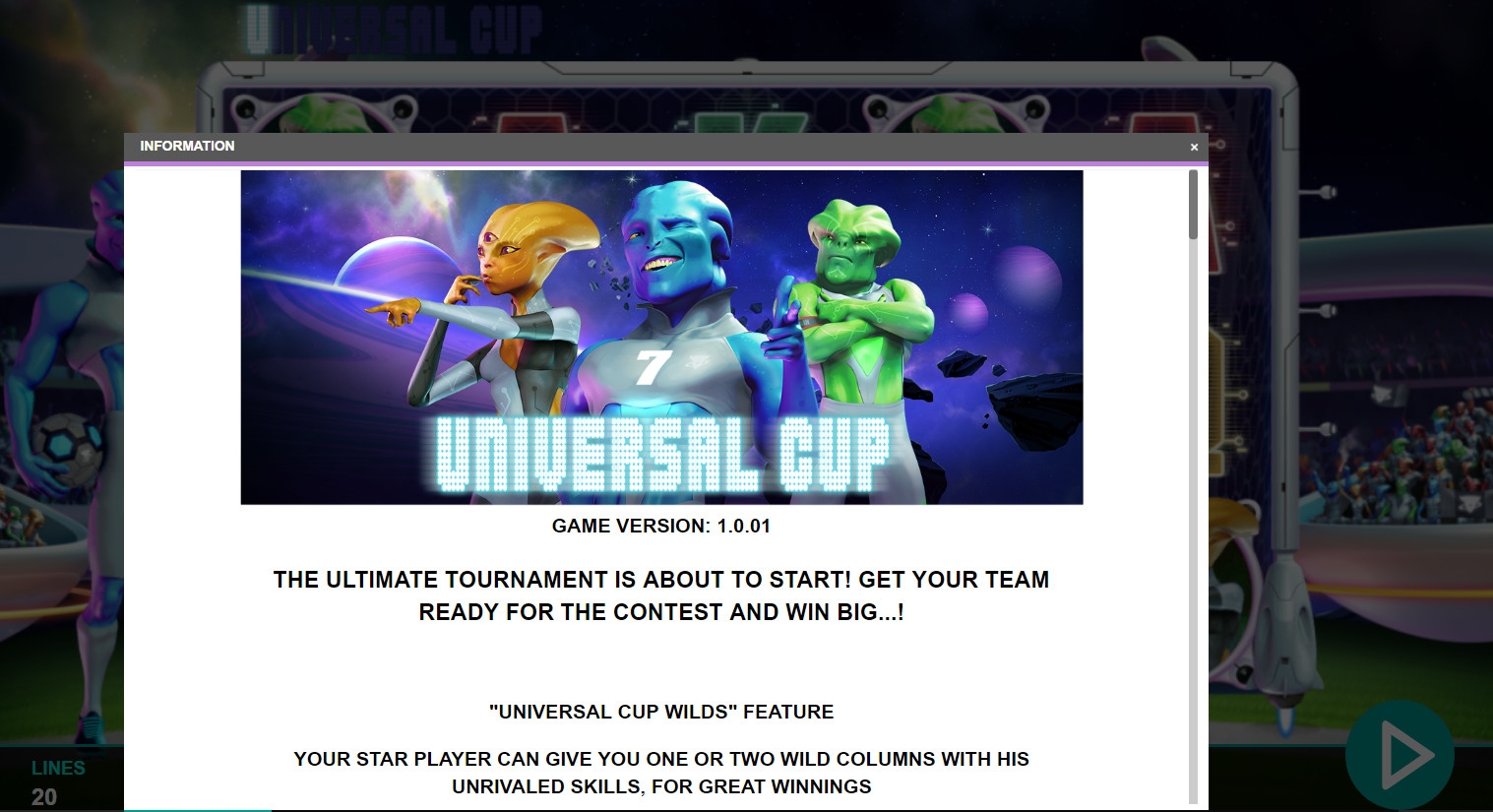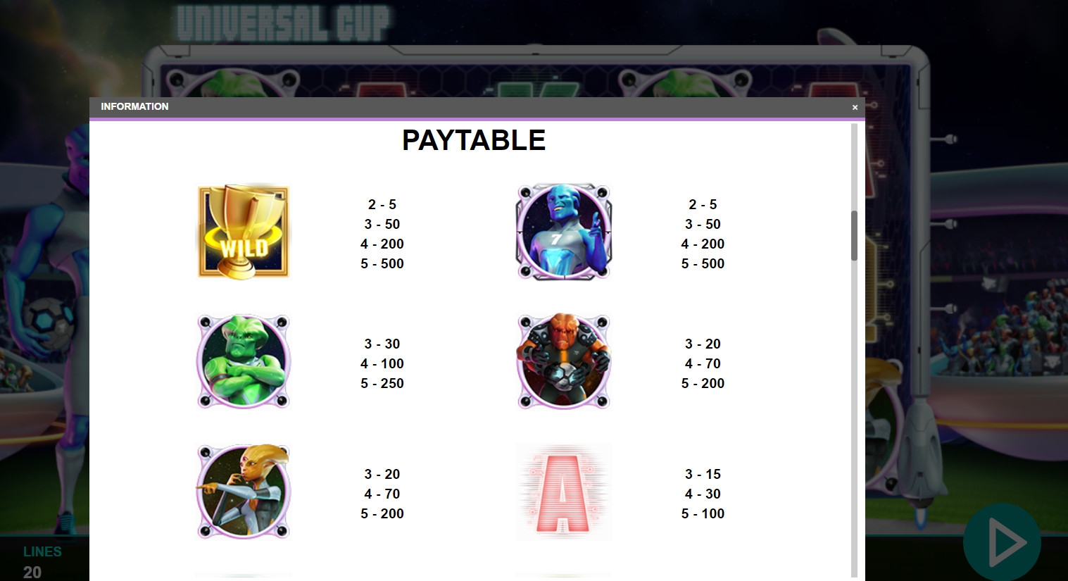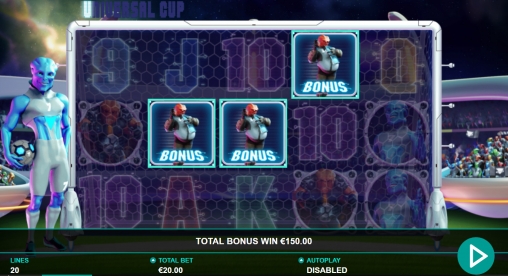 В игровом аппарате Universal Cup пять барабанов, двадцать постоянно активных полос и пятнадцать картинок на основном экране.