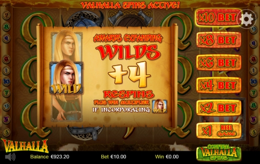 Доступны несколько уровней ставок серии Valhalla Spins. На базовом этапе на спин принимается от десяти центов до двухсот евро. С увеличением суммы на кону в два, четыре, шесть, восемь или десять раз активируются расширяющиеся джокеры и бесплатные респины.