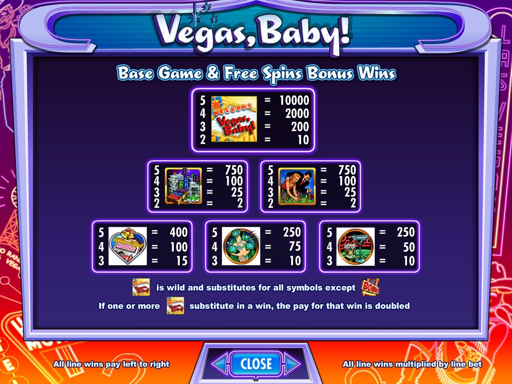 Формирование выигрышных комбинаций в видео-слоте Vegas, Baby! производится на активных линиях по самым распространенным правилам. Несколько (от двух или трех) одинаковых картинок должны выпасть непрерывной цепочкой, начиная с первого барабана. Как обычно, только старшая комбинация на линии дает выплату.