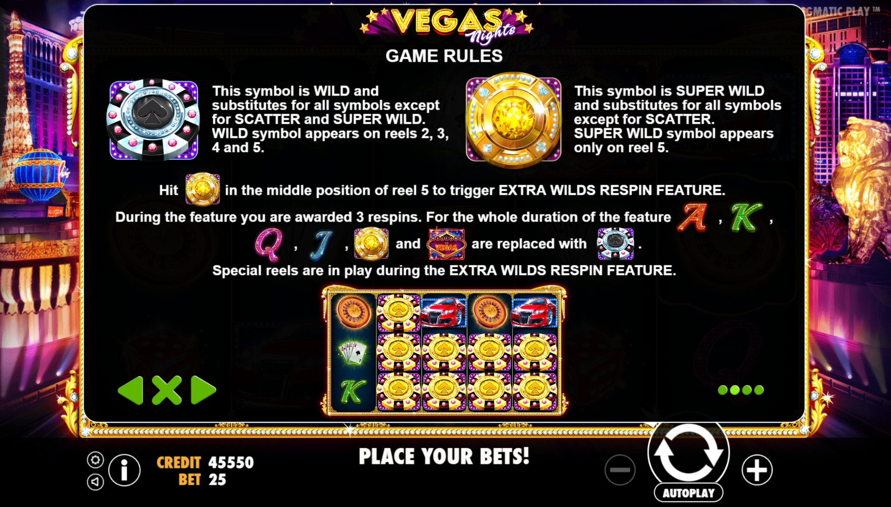 - Extra Wilds Respin Feature – Начинаются три повторных вращения барабанов, которые проходят на деньги казино. Все карточные номиналы, золотые фишки и знаки Лас-Вегаса заменяются на джокеры.