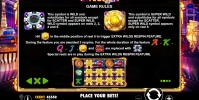 - Super Wild (золотая фишка) выпадает только в пятой колонке и тоже является джокером, который может быть использован вместо базовых изображений. Еще он запускает респины, появляясь в средней позиции на пятом столбце.