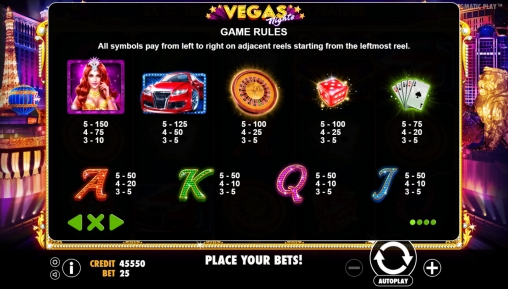 На экране игрового автомата Vegas Nights появляются сверкающие яркими огнями буквы J, Q, K и A, а также карты, игральные кости, колесо рулетки, красный автомобиль и девушка из варьете.