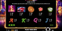 Таблица включает в себя четыре страницы с потенциальными выплатами, информацией о специальных картинках, описанием бонусов, диаграммой линий и общими правилами.