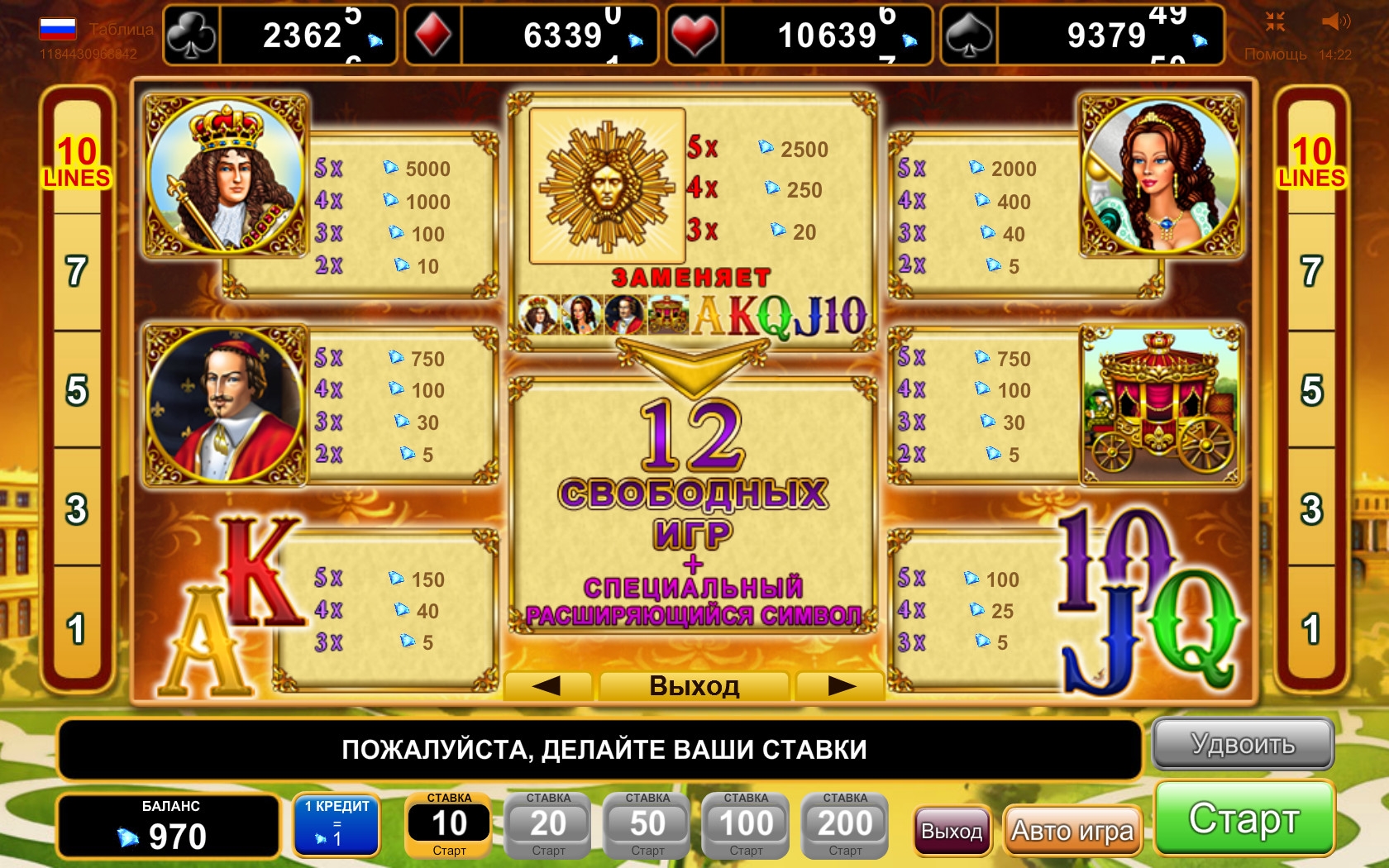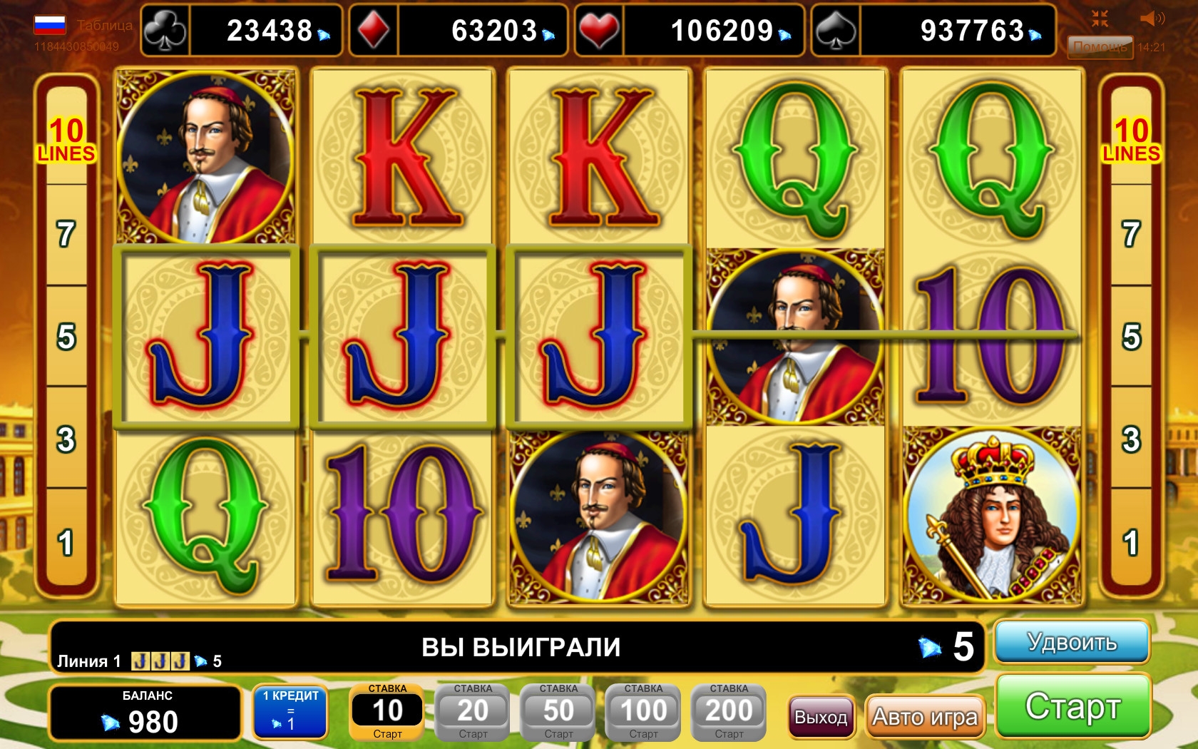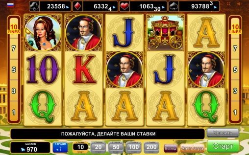Запустив видео-слот, вы увидите на экране одного из многочисленных французских монархов, кардинала и прекрасную даму (можете сами додумать, являются ли они историческими личностями). Также можно увидеть роскошную карету и разноцветные буквы и цифры, обозначающие номиналы карт от десятки до туза.