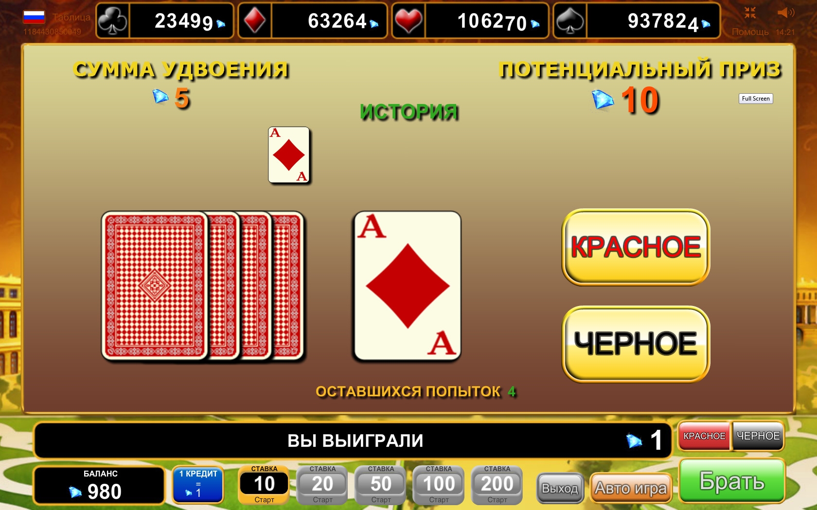 Если он выбирает второй вариант, открывается дополнительный экран с закрытой картой. Нужно угадать ее цвет. Если это удается, выплата удваивается. Если случается ошибка, клиент проигрывает деньги, поставленные на кон. Право на ошибку не предоставляется. В одном раунде можно играть до пяти раз кряду.