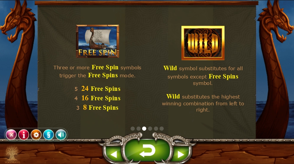 Специальными возможностями обладают символы Wild (золотая надпись), Free Spin (корабль викингов) и Bonus (сундук с сокровищами). Об их функциях читайте дальше: