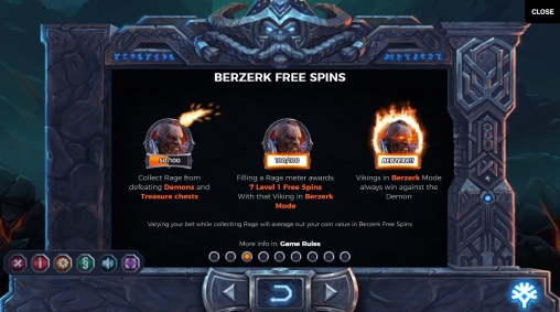 - Level 1 Berzerk Free Spins – Три, четыре или пять скаттеров начинают семь, двенадцать или шестнадцать фри-спинов первого уровня. Также семь вращений стартуют при заполнении шкалы ярости. В ходе раунда игра ведется на деньги казино. Викинги действуют в режиме берсерка. Они всегда побеждают демонов и превращаются в Sticky Wilds. На протяжении розыгрышей идет битва с Властелином Цепей (Lord of Chains). Если его удастся одолеть, спины переходят на второй уровень.
