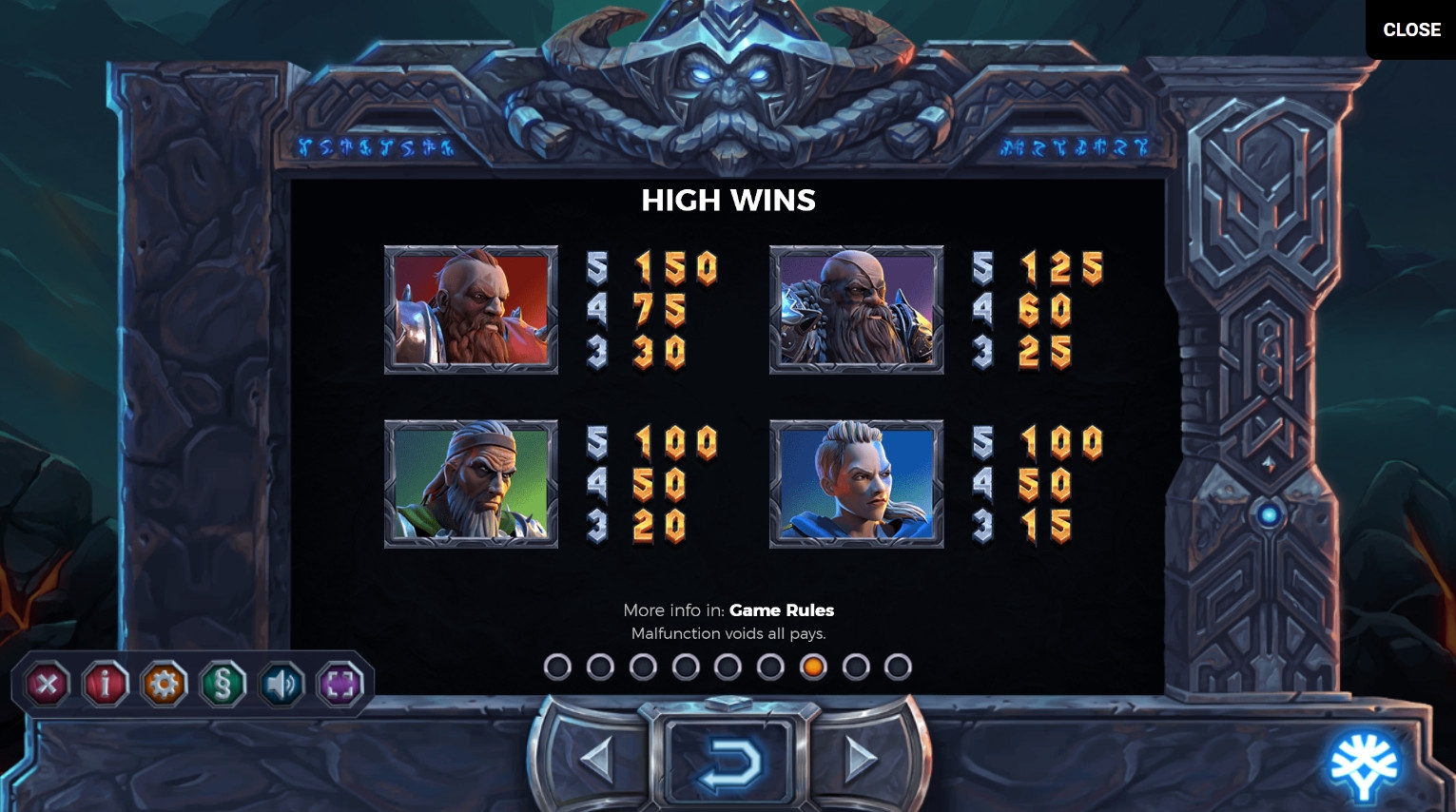 Базовых картинок в игровом автомате восемь: четверо викингов, включая одну девушку, и четыре иконки с разными видами оружия. Одинаковые картинки зачастую появляются вертикальными стеками.