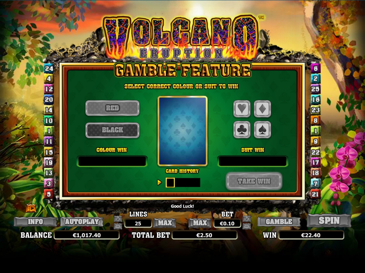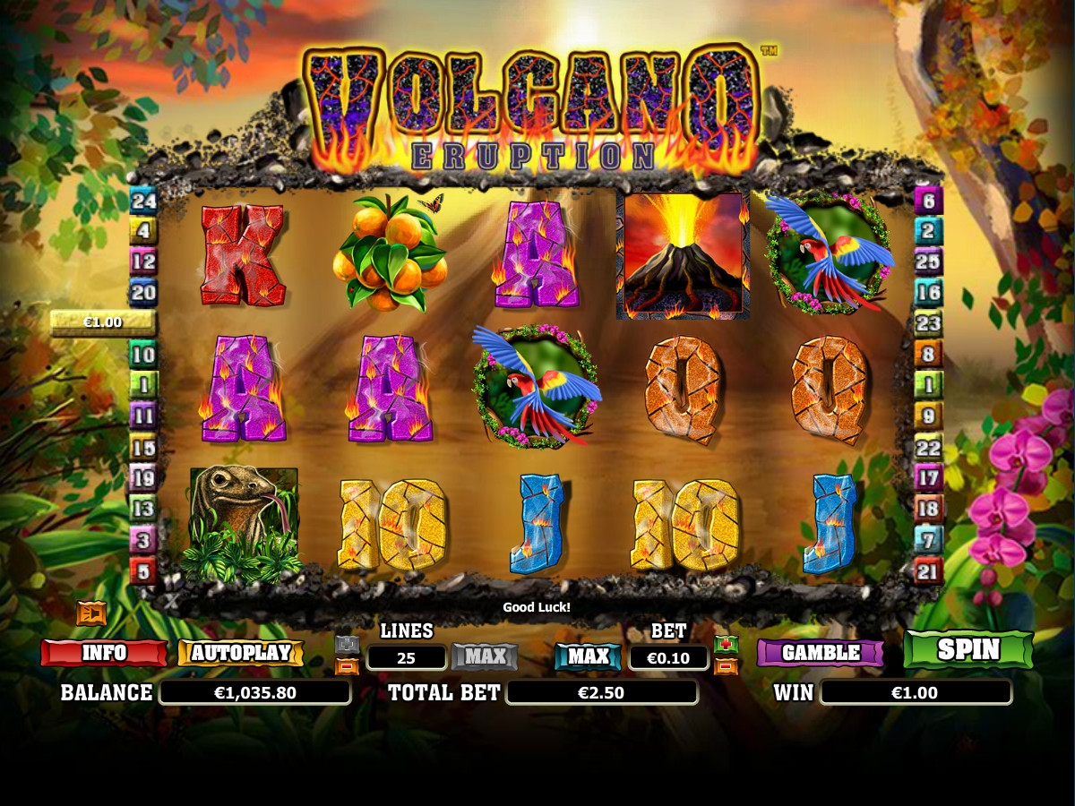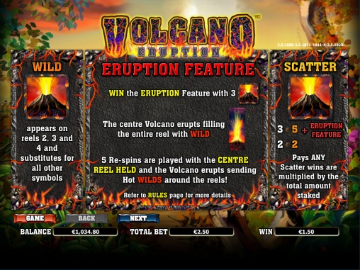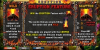 Volcano Eruption – модель с пятью барабанами, двадцатью пятью линиями, пятью рядами картинок на основном экране и широким выбором функций, в числе которых повторные спины, особые символы, игра по шансам и другие опции.