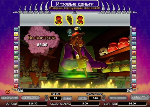 Во время бесплатных игр на пятом барабане выпадают картинки с изображением различных компонентов для создания магического зелья. Они будут собираться в специальном окошке над барабанами, и вы сможете их использовать на втором этапе.
