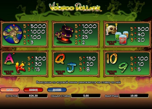 Полный перевод интерфейса игрового автомата Voodoo Dollars на русский язык избавляет нас от необходимости описывать функции кнопок и окошек. Вы запросто разберетесь во всем самостоятельно.