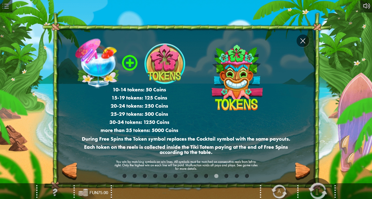 • Free Spins – Стартует двадцать один фри-спин. Они проходят на деньги заведения. В ходе вращений выпадают джокеры двух видов. Они расширяются в разные стороны и могут занимать до пяти ячеек. Коктейли превращаются в фишки. Они накапливаются на отдельном балансе. От десяти собранных чипов дают выплату. Она может достигать пяти тысяч монет текущего номинала.
