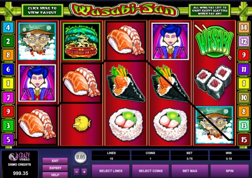 Сегодня японской кухней нас угощают в игровом заведении Crazy Vegas. Там вы можете играть на игровом автомате на интерес, но получить выплаты можно только если вы потратите на эту мелочь пару минут. Тем более, что игровой автомат без регистрации Wasabi – San того стоит.