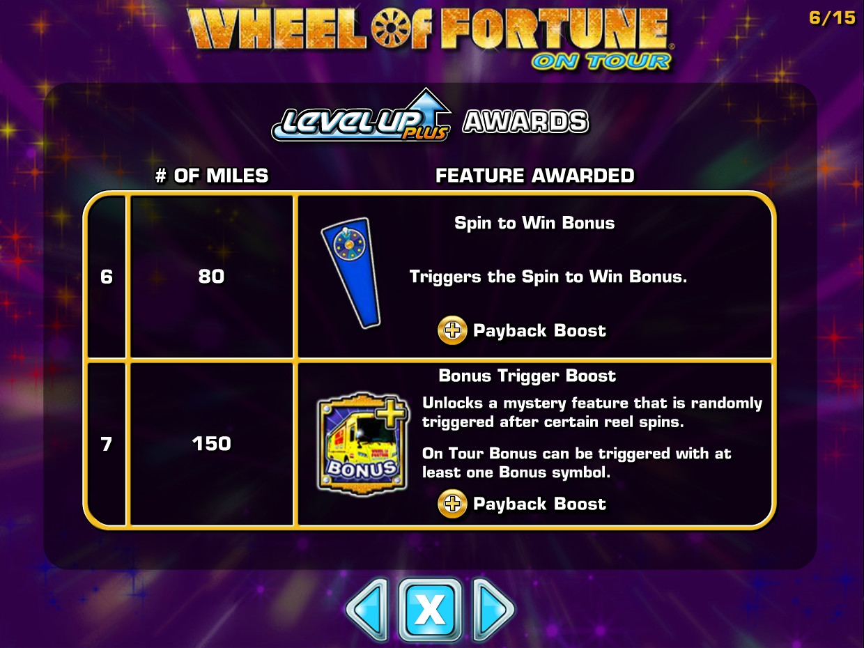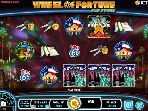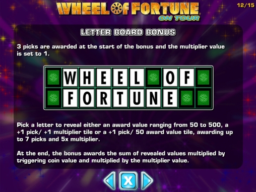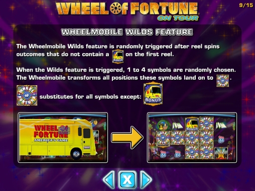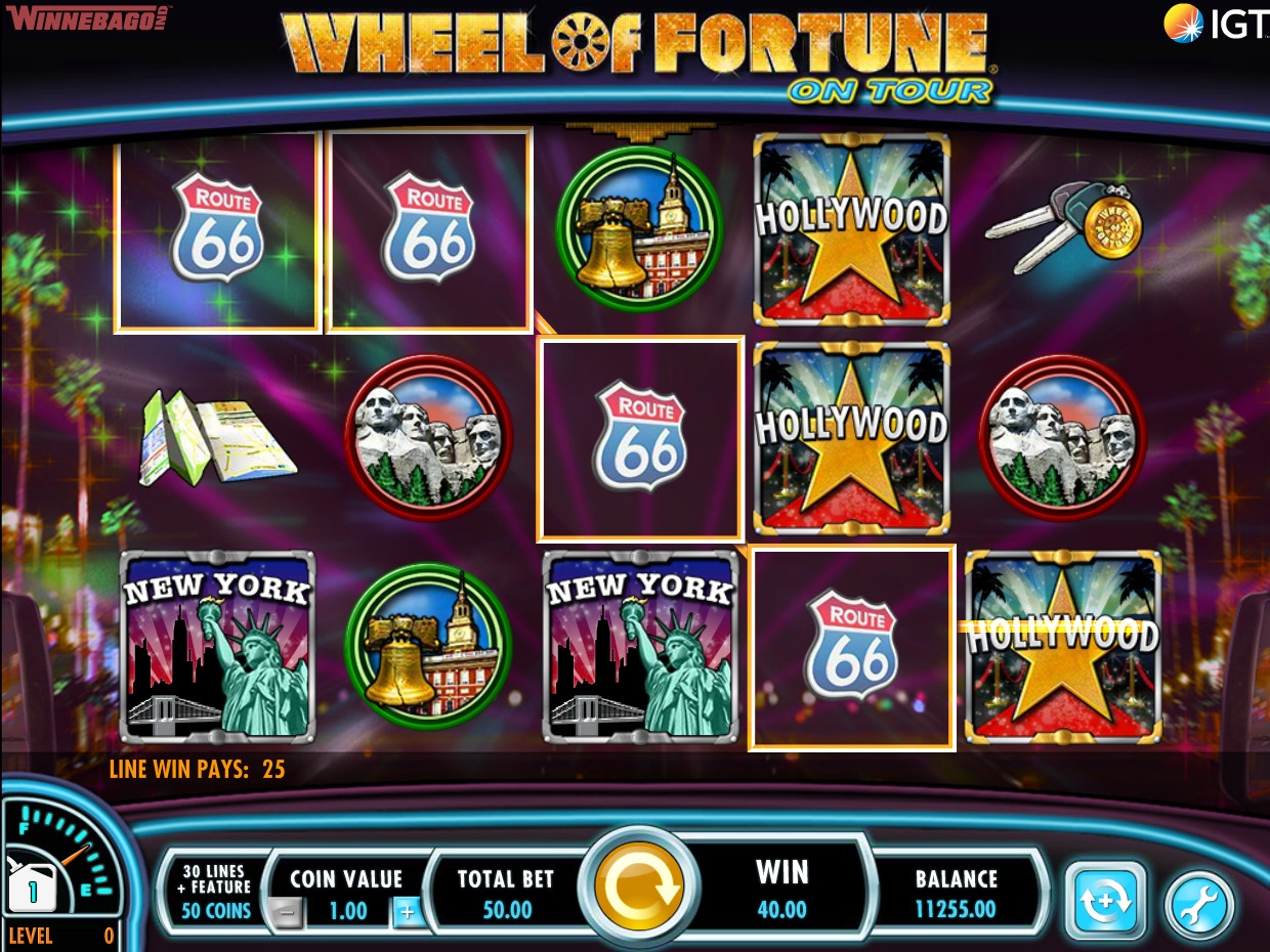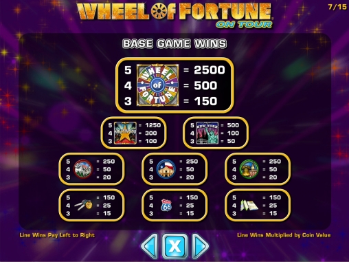 Wheel of Fortune on Tour представляет собой модель с пятью барабанами и тридцатью постоянно задействованными линиями. На экране одновременно помещается пятнадцать картинок.