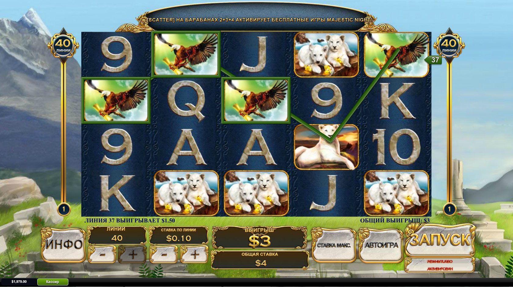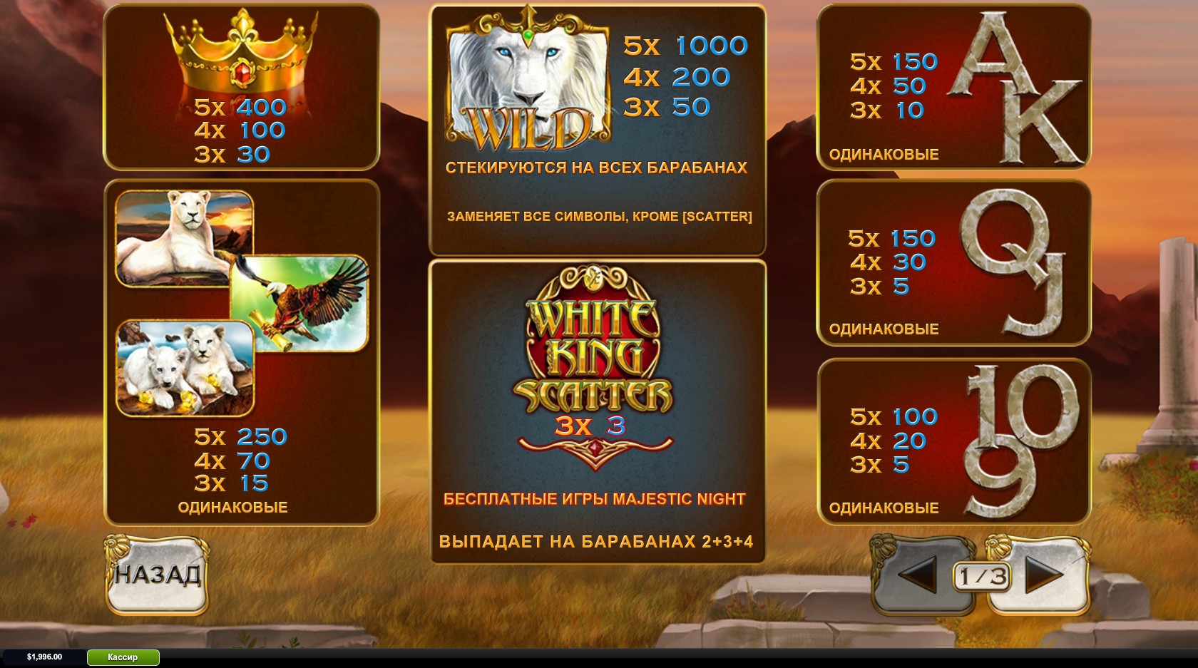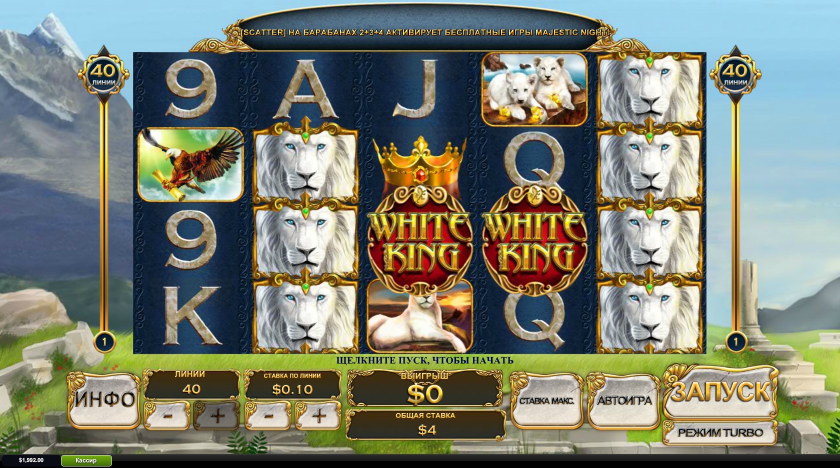 Открыв игровой автомат «Белый царь», вы увидите на барабанах золотую корону, белую львицу и львят, белоголового орлана со свитком в лапах, а также номиналы игральных карт от девятки до туза.