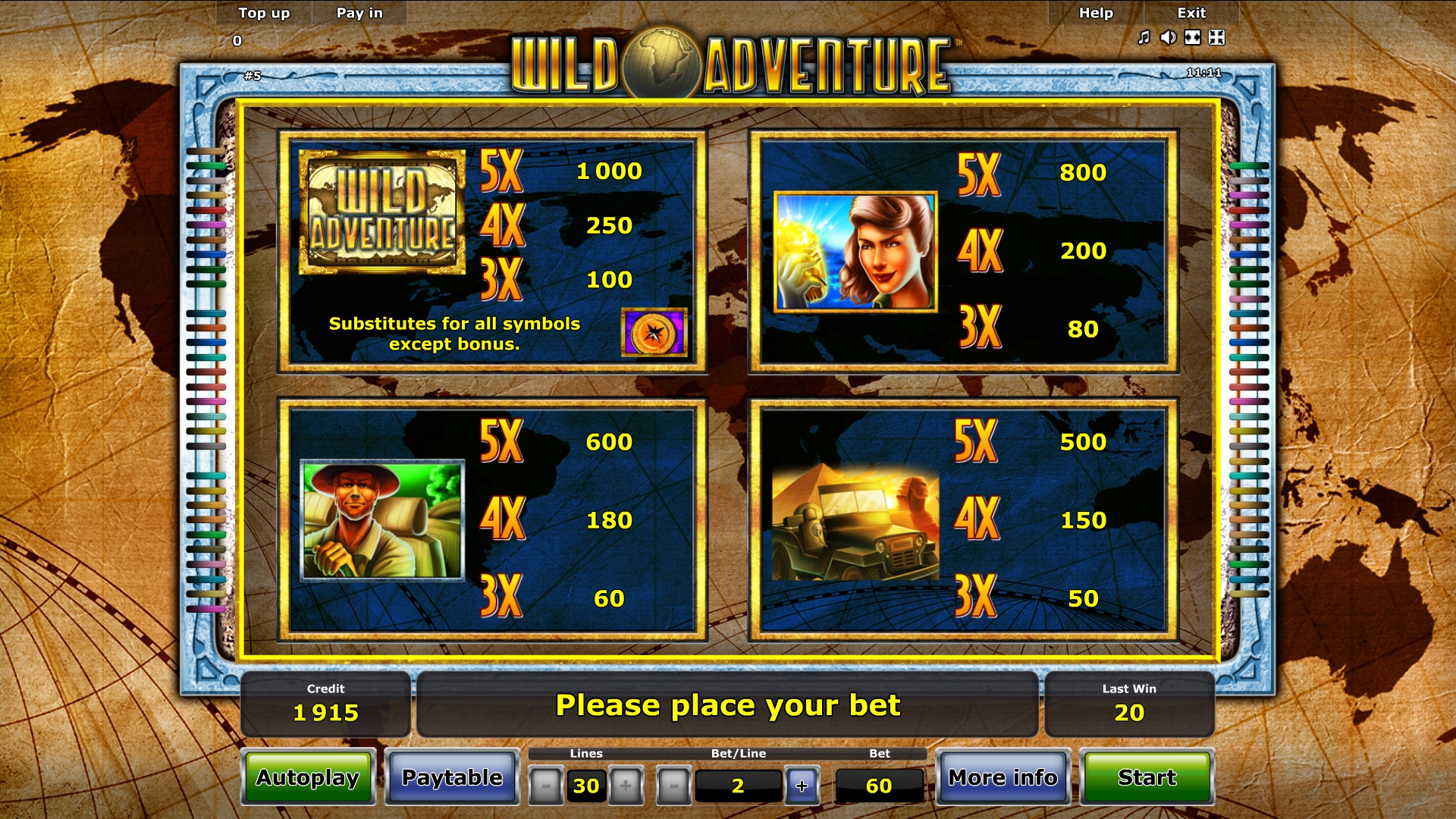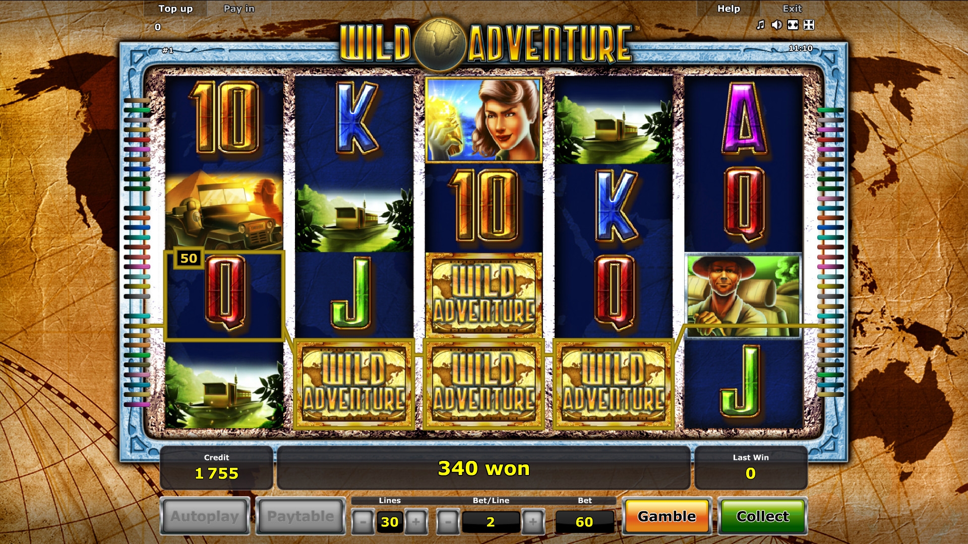 Для расчета выплаты ставка по линии умножается на коэффициент образовавшейся комбинации. Он бывает в Wild Adventure от х5 до х500. Если в одном спине сразу несколько последовательностей, начисленные по ним кредиты суммируются.