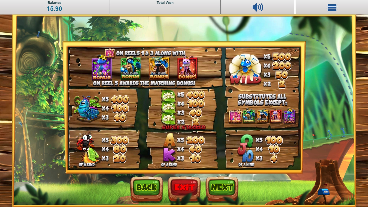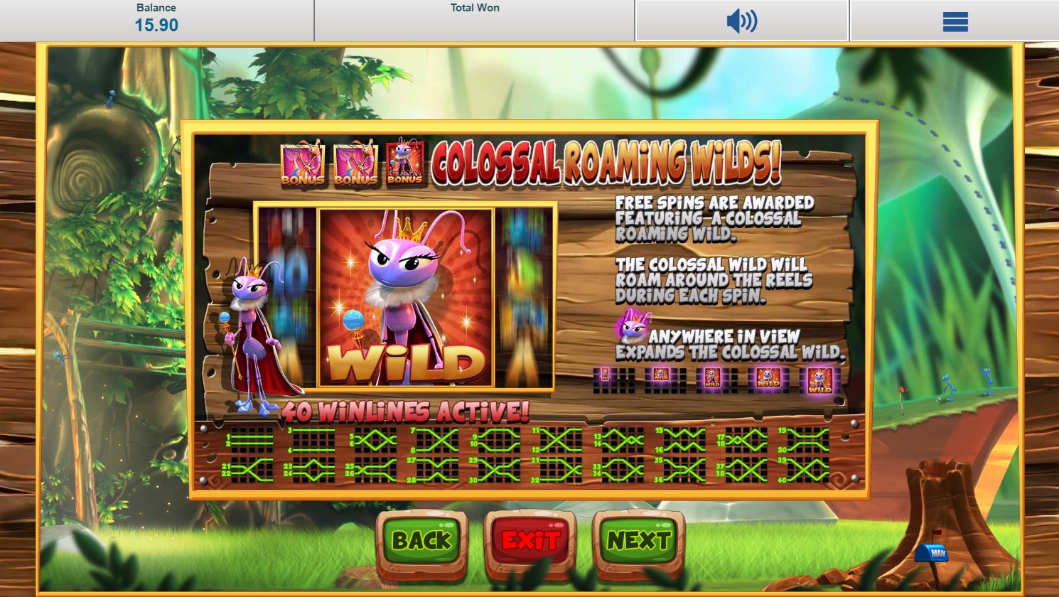 - Bonus (разные типы муравьев: рабочий, солдат, полковник и королева) появляются только в пятой колонке и нужны для запуска тематических бонусных игр.